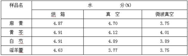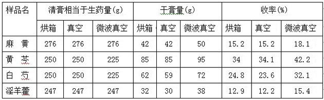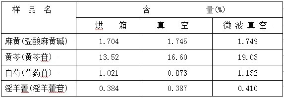 干燥技術是中成藥生產過程中的重要工藝過程之一,隨著對干燥特性認識的進一步深化,不同干燥方法以及不同干燥溫度對藥品質量影響受到廣泛關注。為了驗證烘箱干燥,真空干燥和微波真空干燥不同的特性及各干燥方法對中藥提取物干燥行為的結果,本實驗對4種中藥浸膏的干燥方法進行了對比實驗,研究了不同干燥方法對中藥中有效成份含量的影響,以期為選擇中藥浸膏干燥方法提供科學依據(jù)。